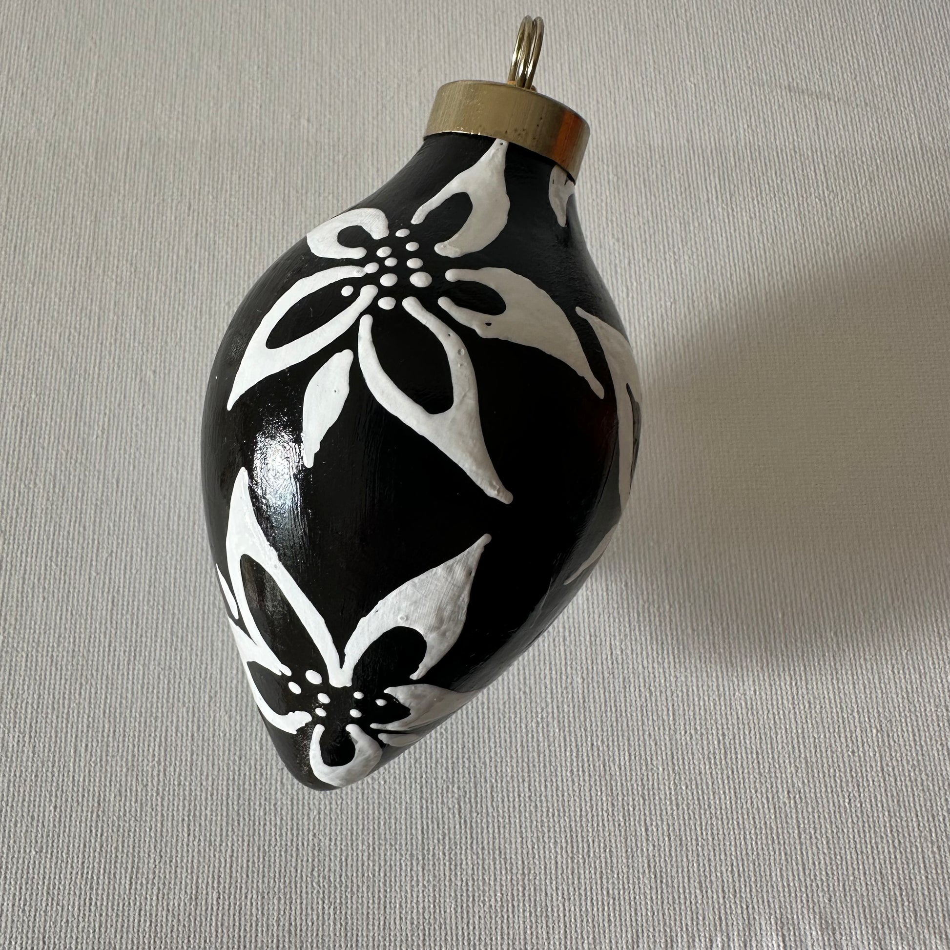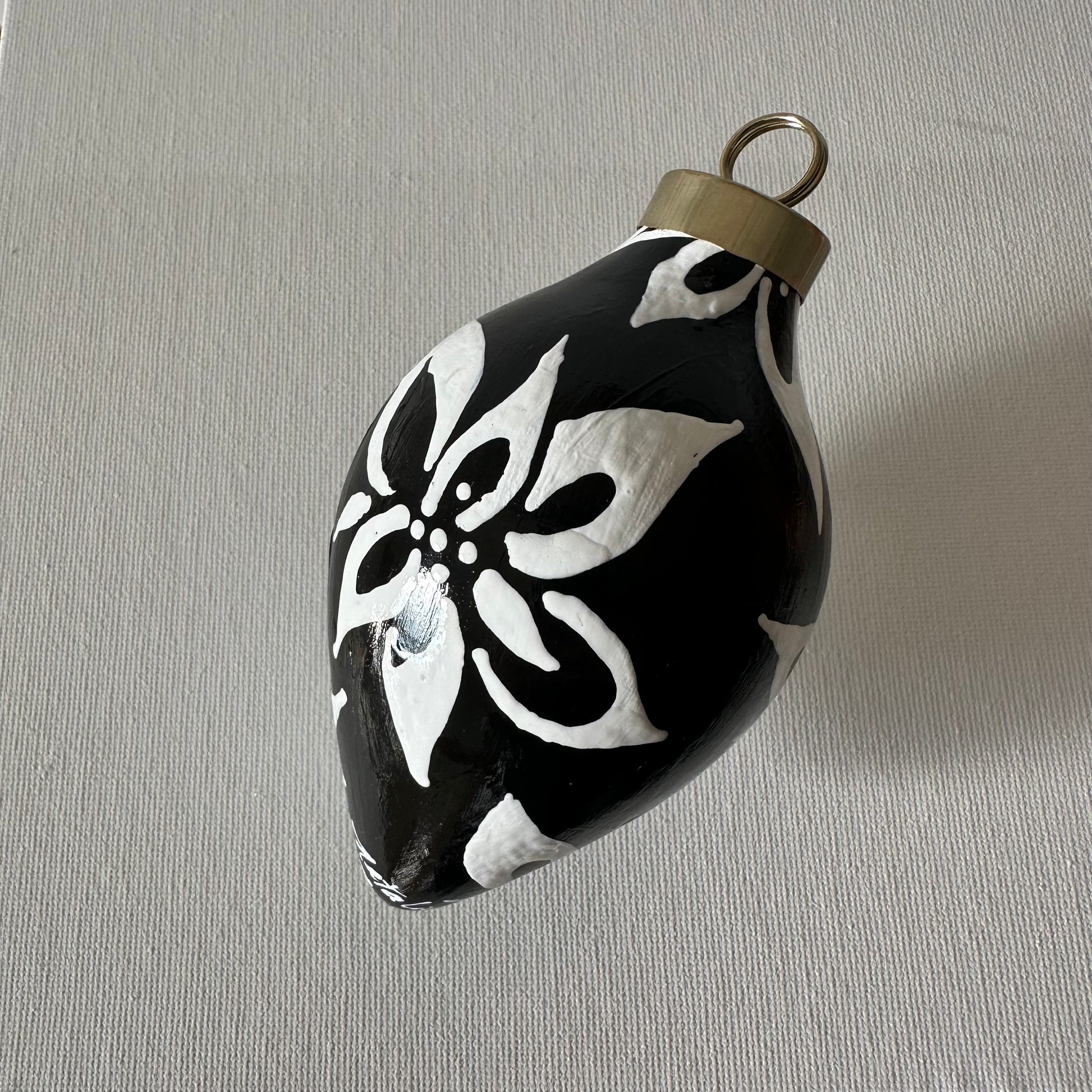 Bold white poinsettia leaves painted atop of an onyx black bisque ceramic ornament. Features a decorative 2025 edition charm.