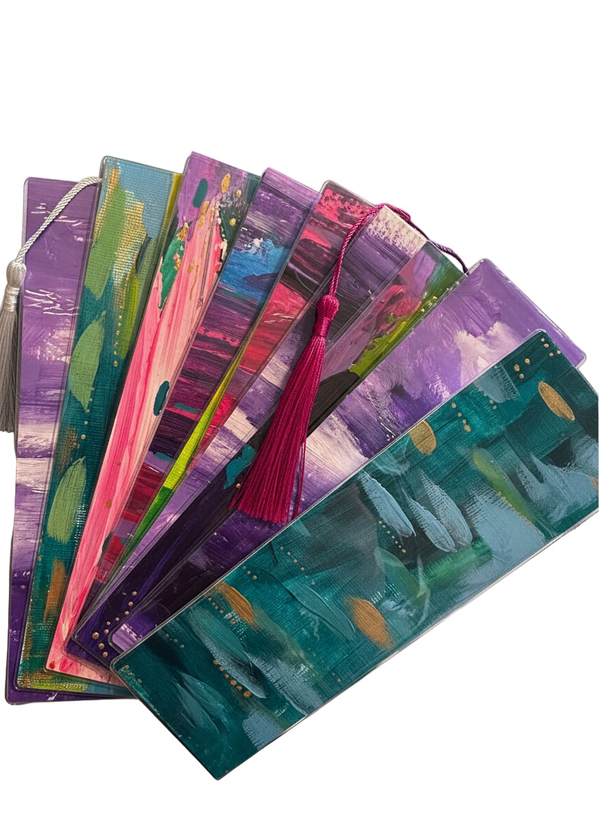This bookmark is made from an original piece of artwork. Likely acrylic painting on acrylic canvas paper, though selections may vary. The painted area is restricted to one side of the bookmark and is protected with a thin flexible plastic sleeve, allowing the bookmark to endure a lot of handling! Each bookmark is accompanied by a coordinating tassel of the artists choosing.