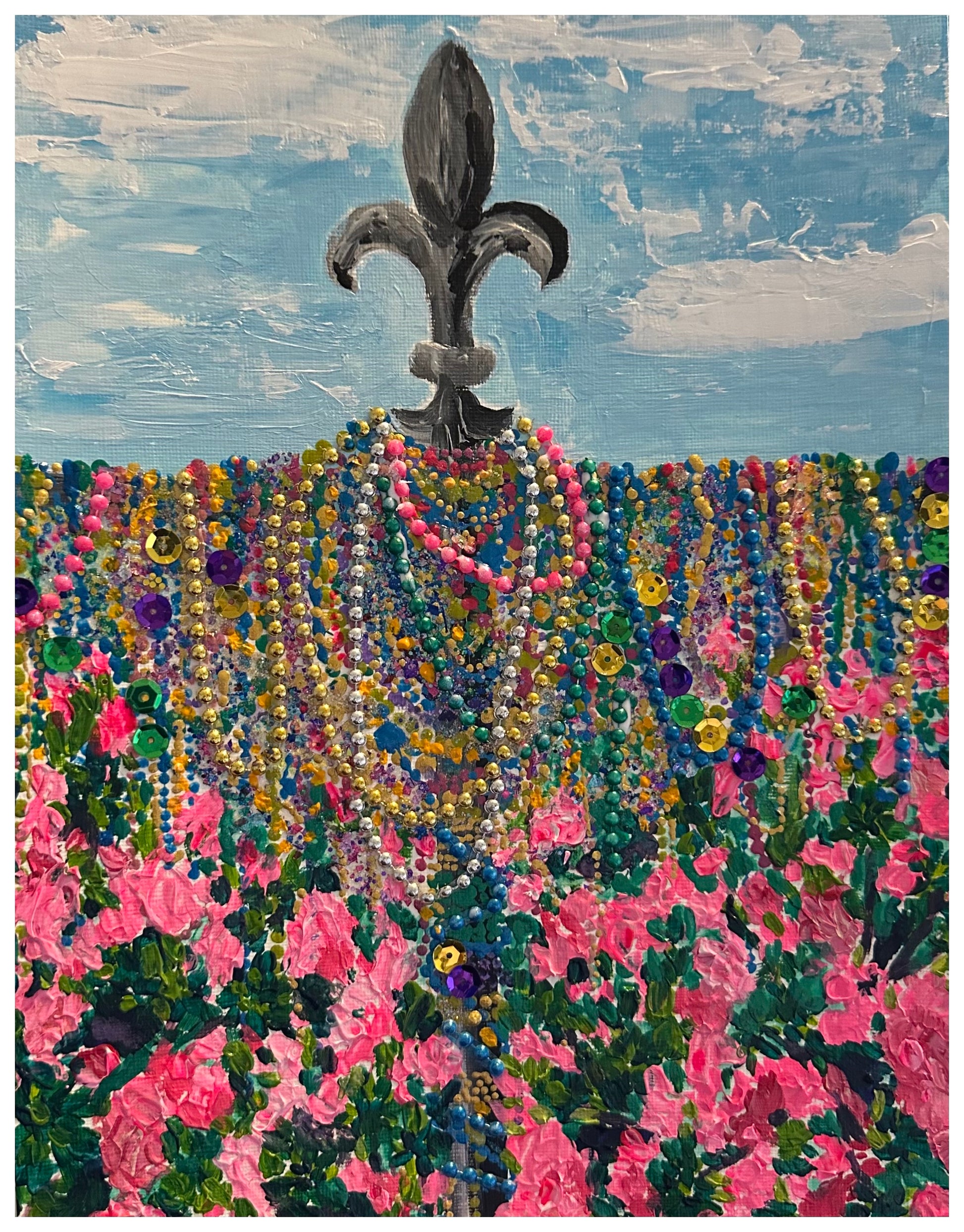 ‘Fleur De Lis Beads’ is a 9” x 12” acrylic mixed media on acrylic paper. This piece was so fun to make! Inspired by lush azaleas bursting through iron fences during the Mardi Gras season. Pile on the beads! Includes dimensional beads, colored foil and glitter accents.