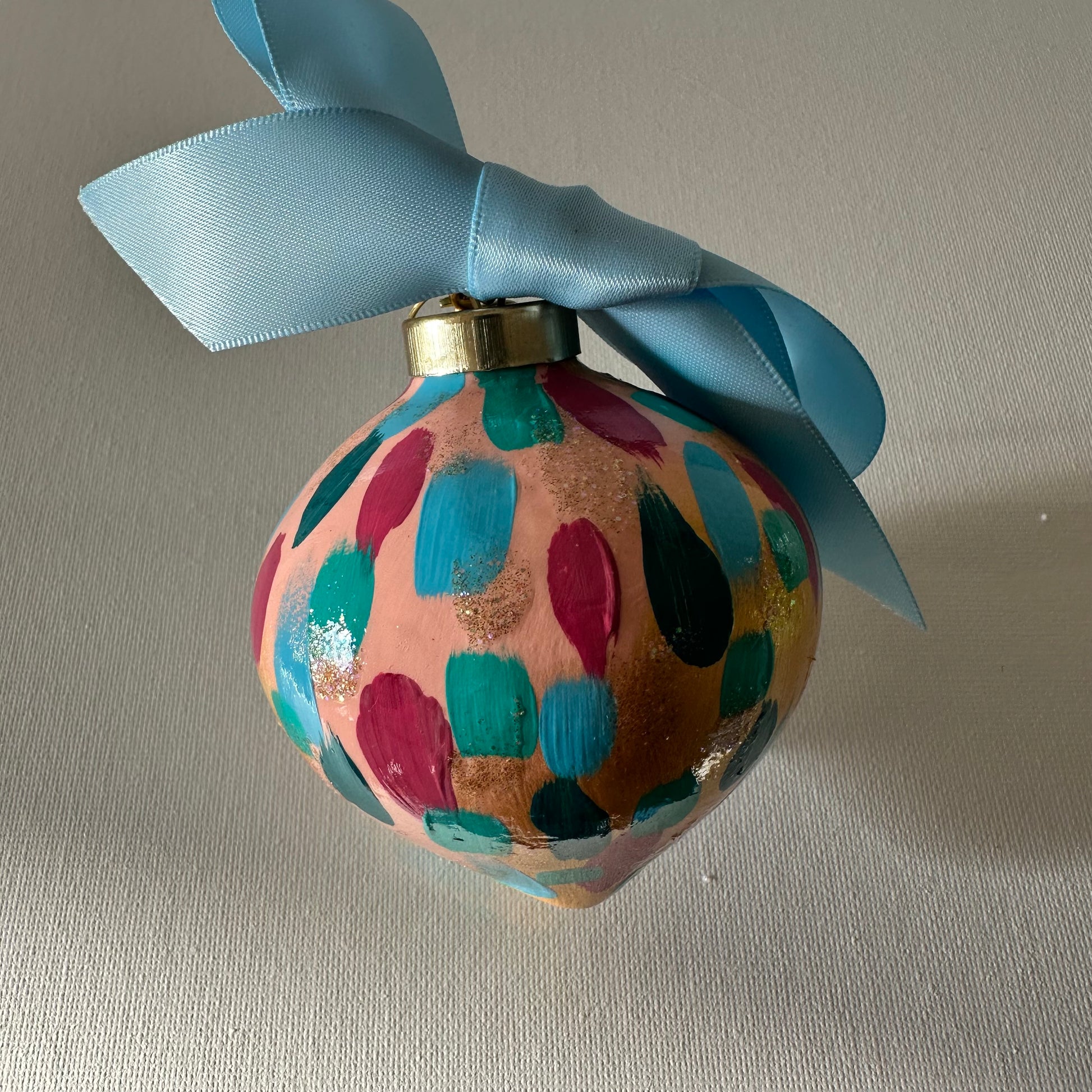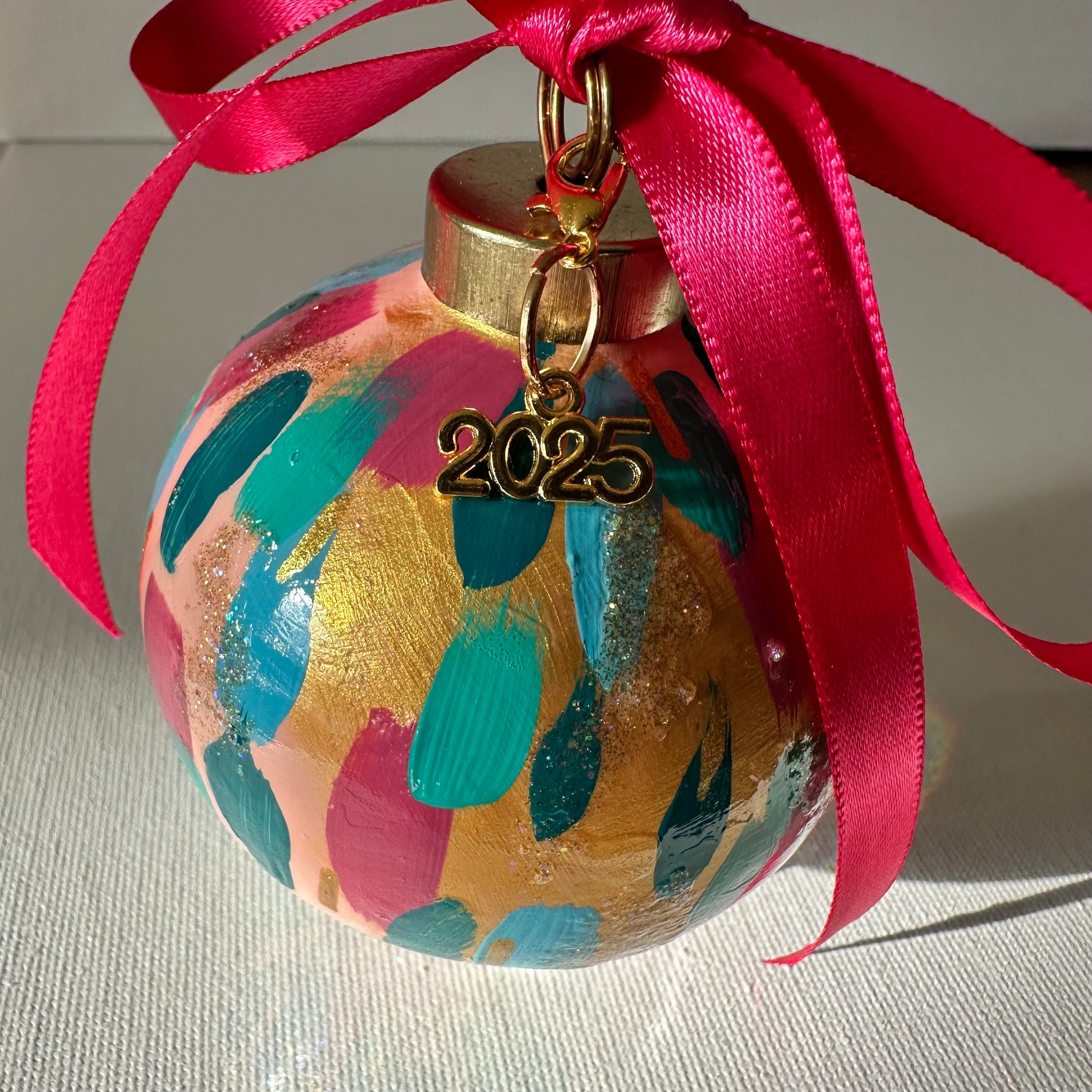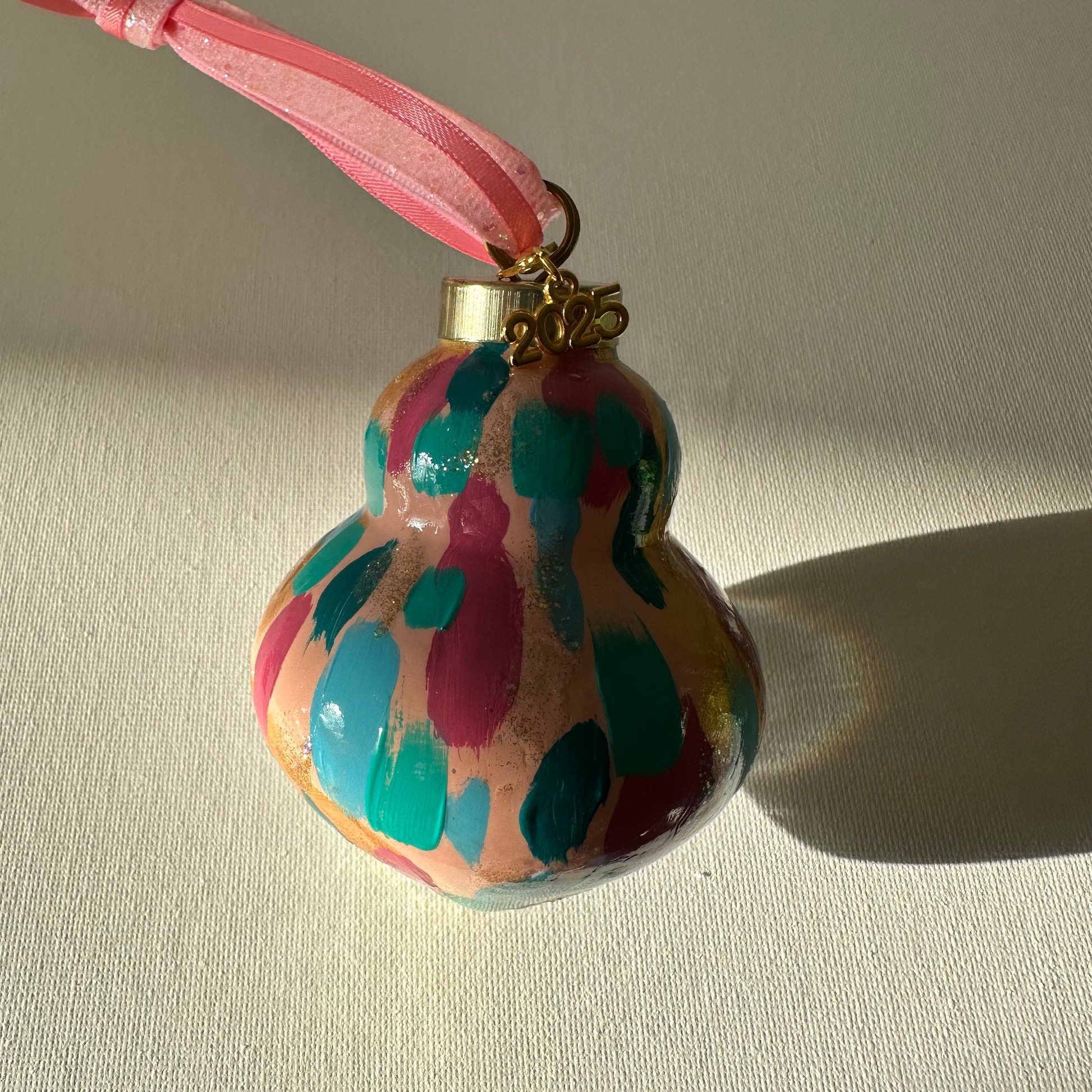 Holiday Party is a fun colorful confetti design painted on pale pink and gold background with glittery accents. This comes in four shapes: ball, onion, carrot, and pear. Unless specified, shape of order will be fulfilled bt the artist. If you have a preference of the shape, please email upon your order. This holiday ornament is bisque ceramic ornament, painted by hand using high quality paints. Using the same process I use for painting an original painting, the ornament is an original piece of artwork. A coordinating ribbon of the artists choice will accompany your ornament as well as a sturdy, decorative ornament hook. The ornament will be individually packaged and make a great gift. Features a decorative 2025 charm.