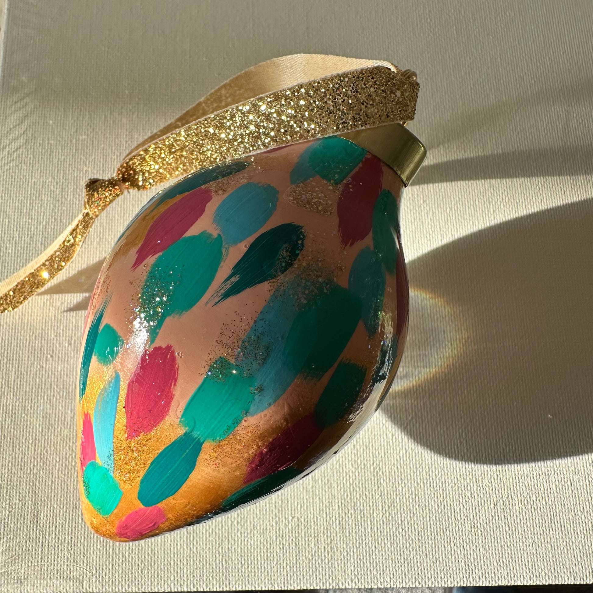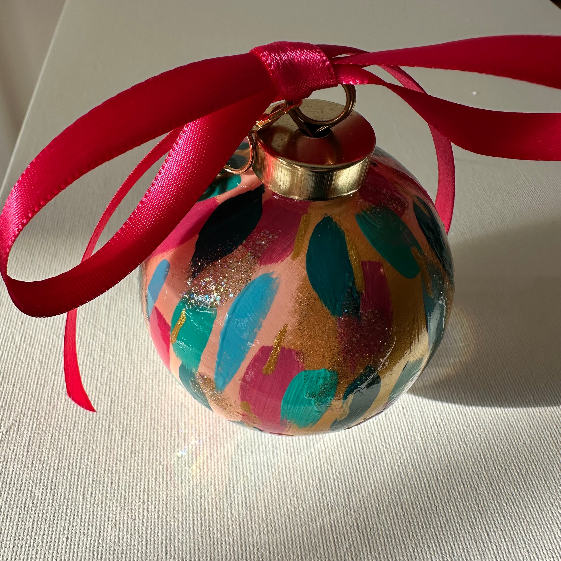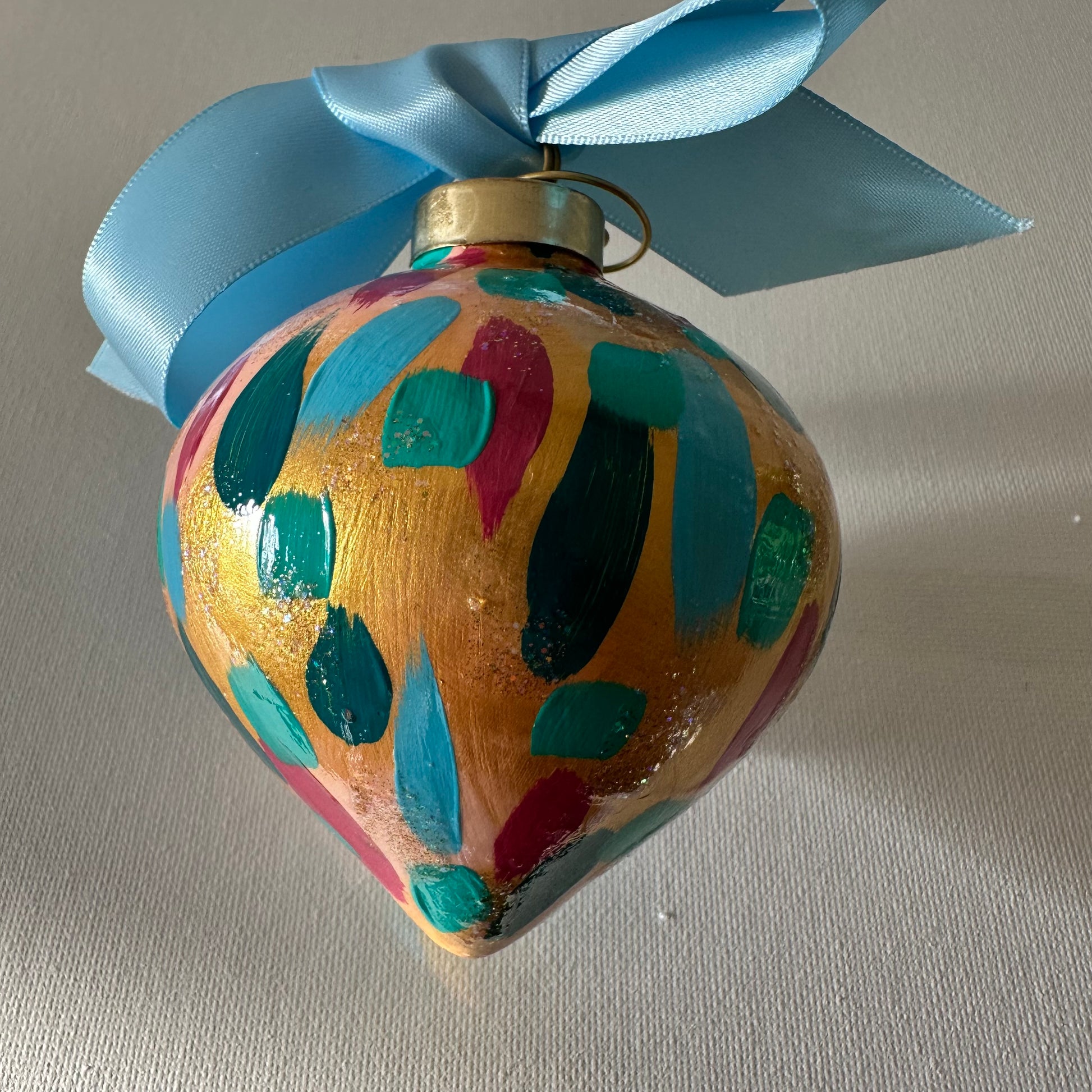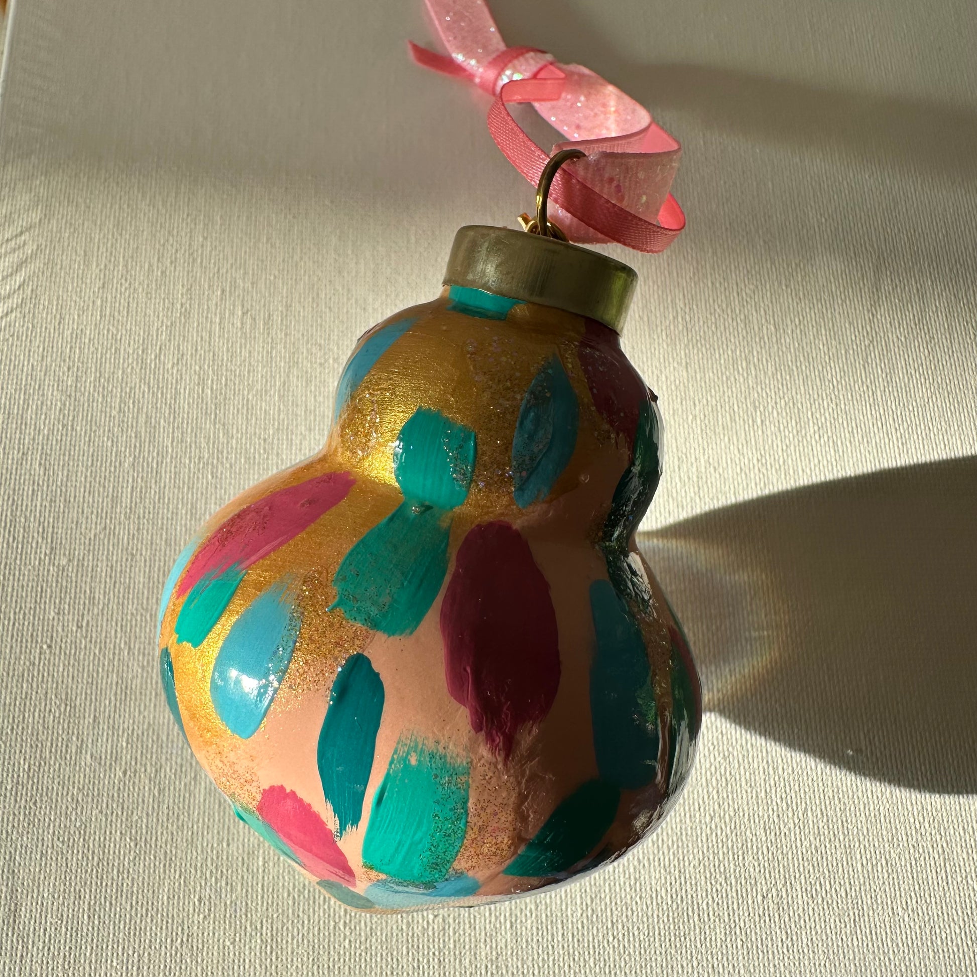 Holiday Party is a fun colorful confetti design painted on pale pink and gold background with glittery accents. This comes in four shapes: ball, onion, carrot, and pear. Unless specified, shape of order will be fulfilled bt the artist. If you have a preference of the shape, please email upon your order. This holiday ornament is bisque ceramic ornament, painted by hand using high quality paints. Using the same process I use for painting an original painting, the ornament is an original piece of artwork. A coordinating ribbon of the artists choice will accompany your ornament as well as a sturdy, decorative ornament hook. The ornament will be individually packaged and make a great gift. Features a decorative 2025 charm.