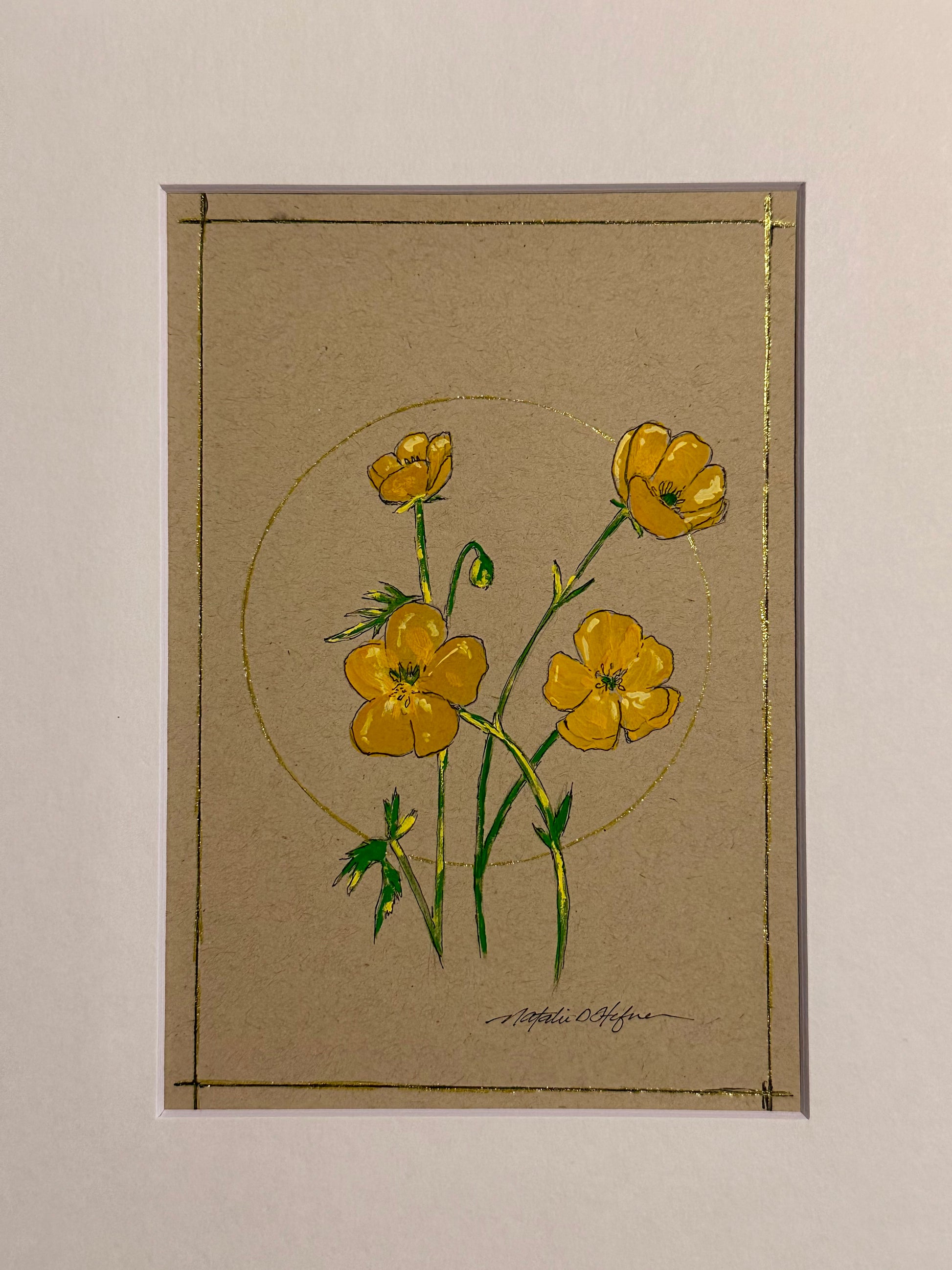 Mixed media Pen and ink drawing of buttercups, colored with gouache paint and accented with gold ink. Drawing on 5”x7” brown cardstock in an 8”x10” white mat.