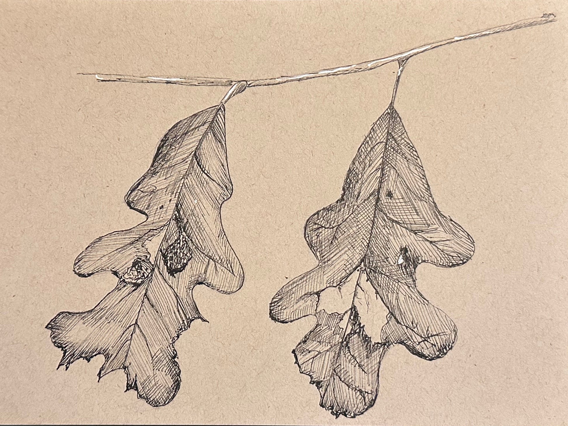 Pen and ink drawing of leaves. Inspired by the 2025 Inktober prompt “Ragged”. Drawing on 5”x7” brown cardstock in an 8”x10” white mat.