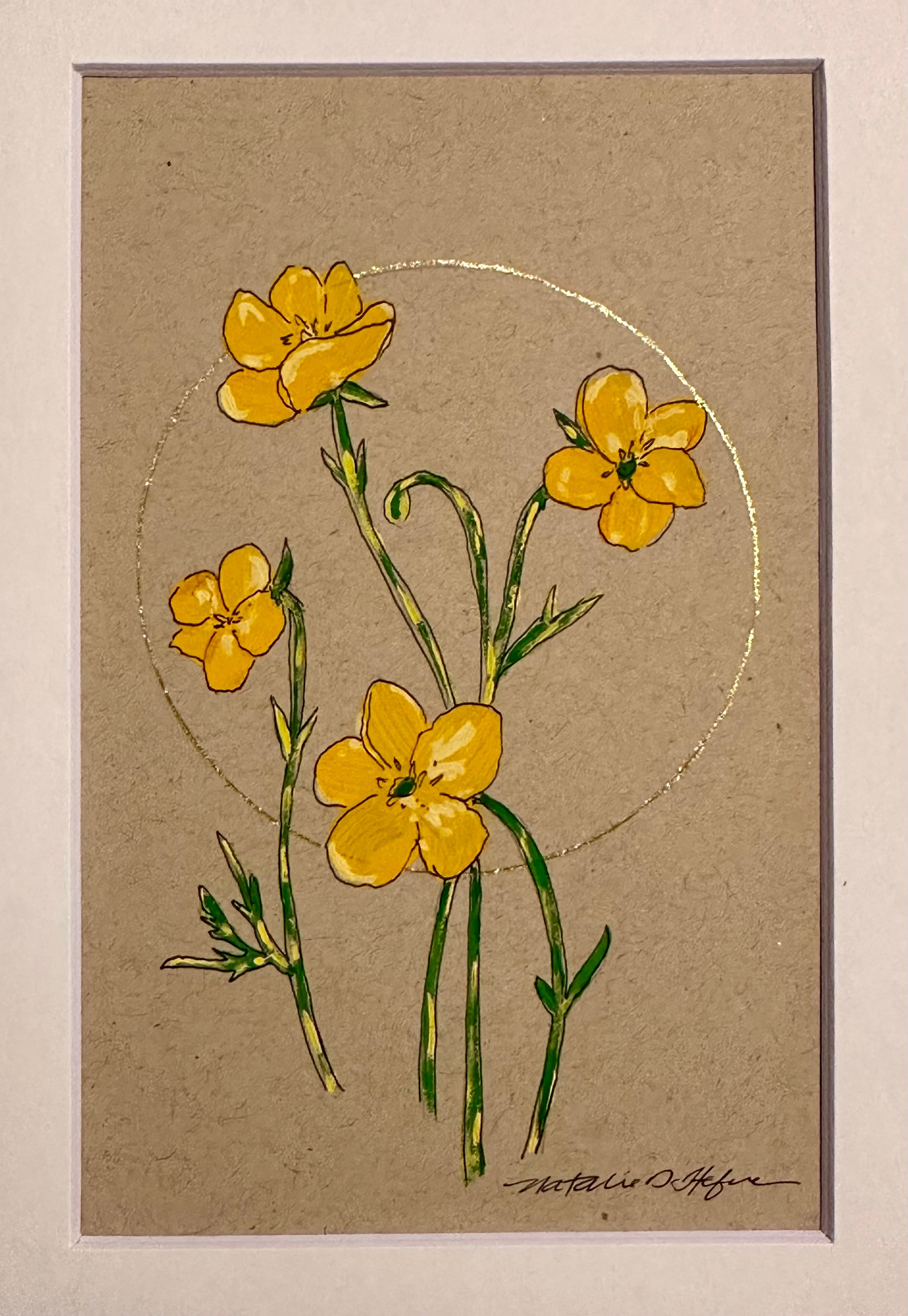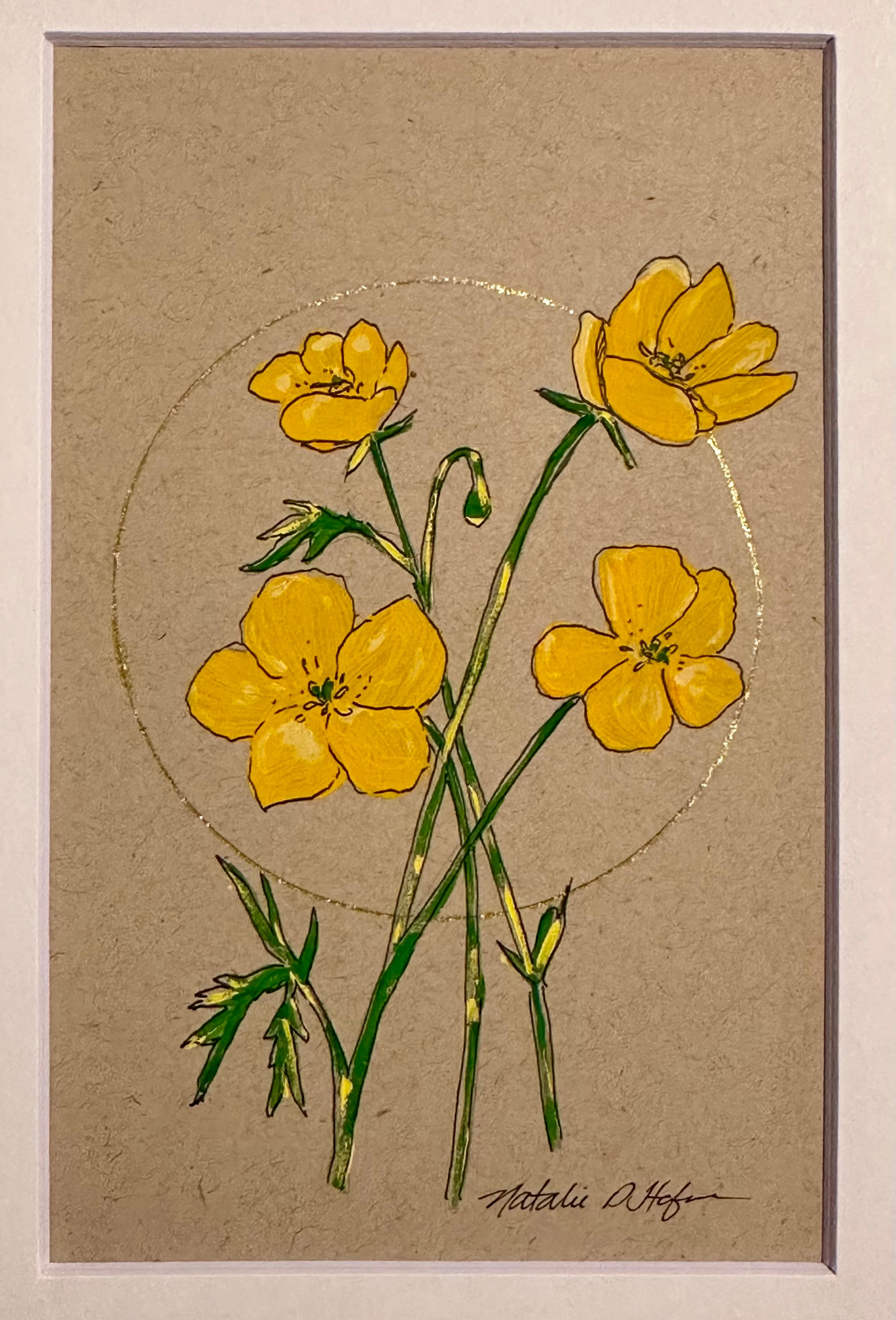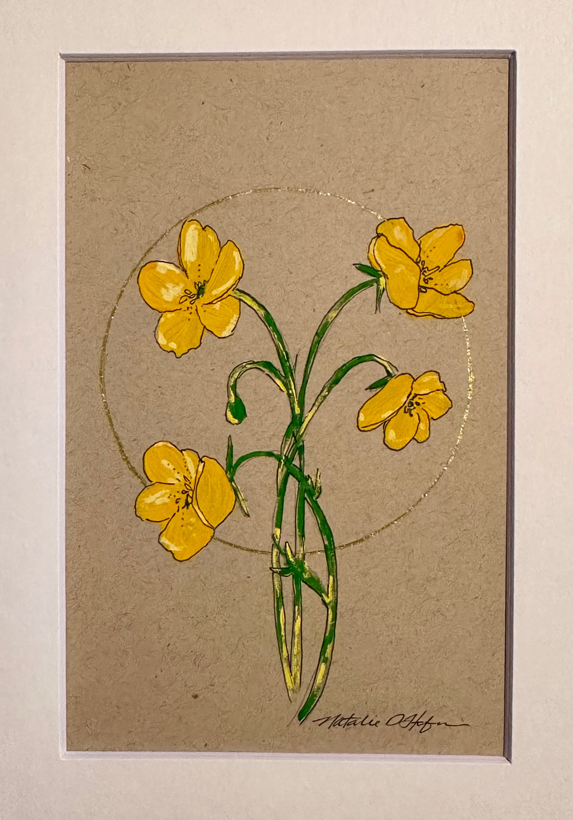 Mixed media Pen and ink drawing of buttercups, colored with gouache paint and accented with gold ink. Drawing on 5”x7” brown cardstock in a 5”x7” white mat. There are four similar drawings; orders for this item will be of the artist’s choice.