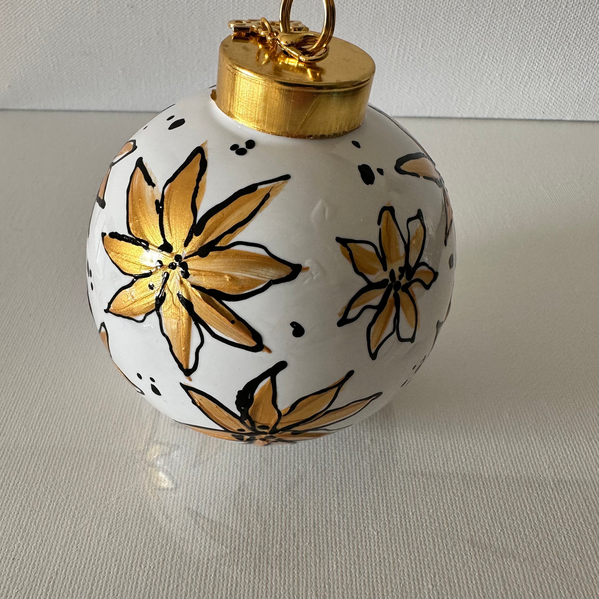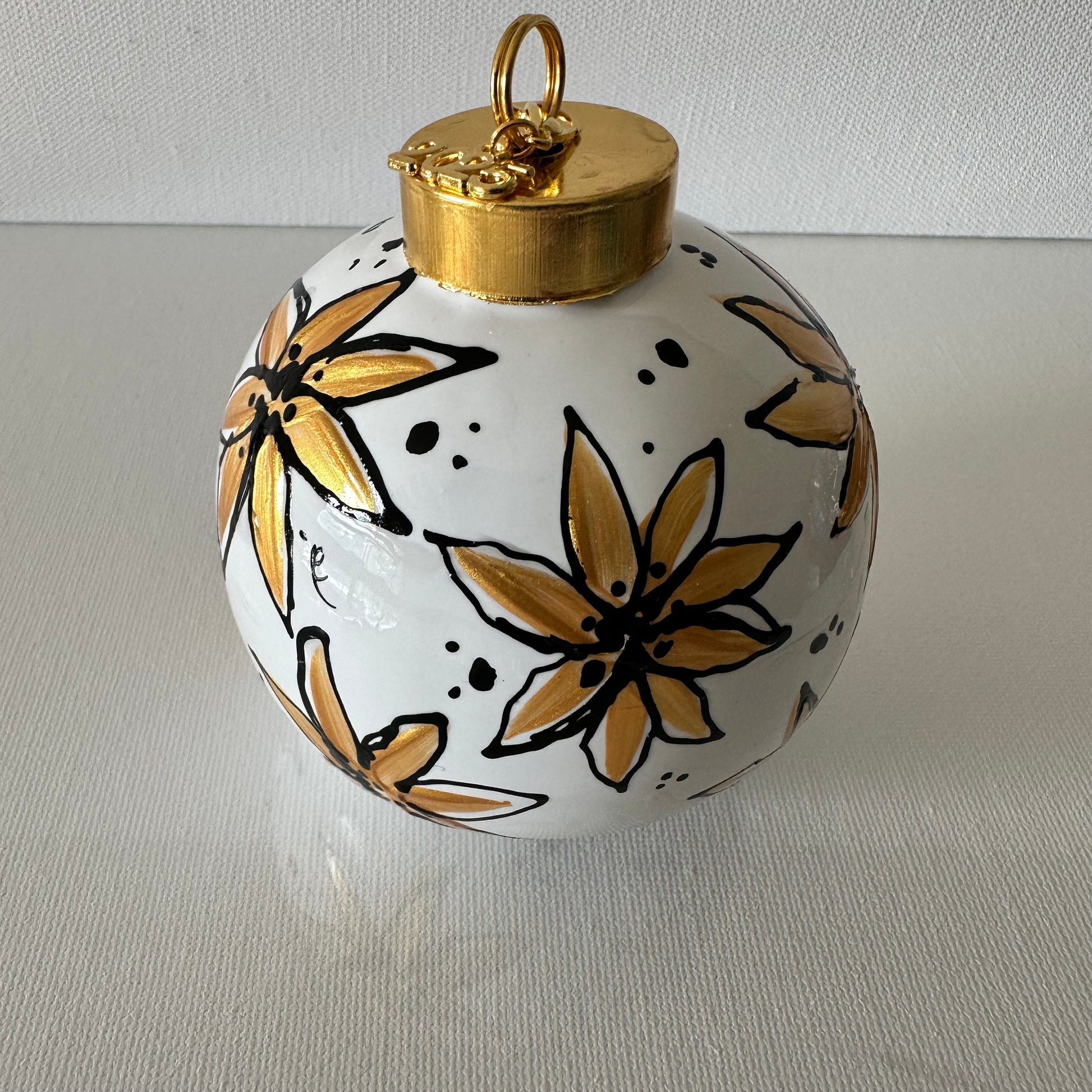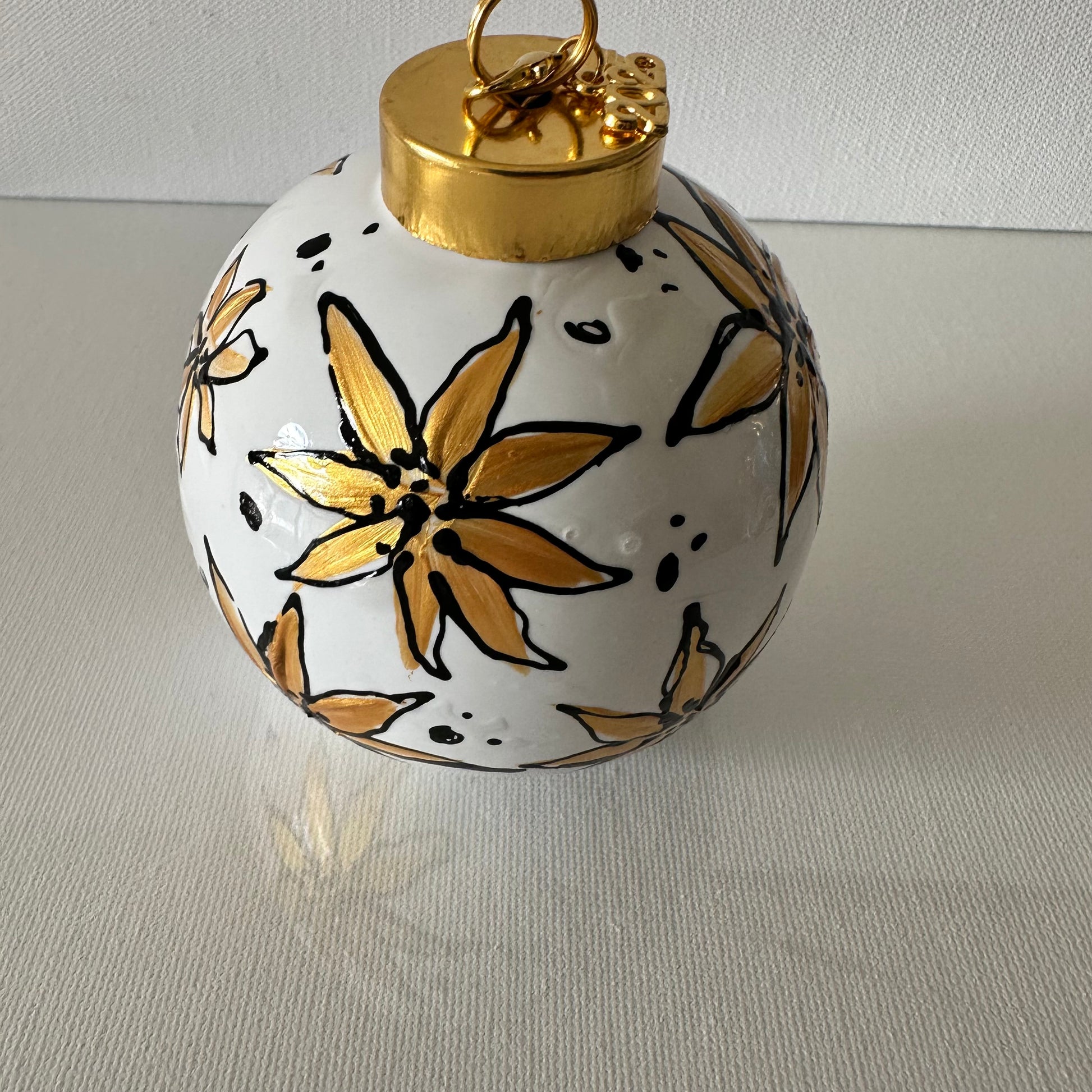 Sketchy Poinsettia is a stunning black and gold heirloom ornament. Golden poinsettia leaves are painted on white ceramic, then finely outlined in black paint to give a sketch drawing effect. The final product may vary slightly from what is pictured as each piece is unique. Features a decorative 2025 edition charm.