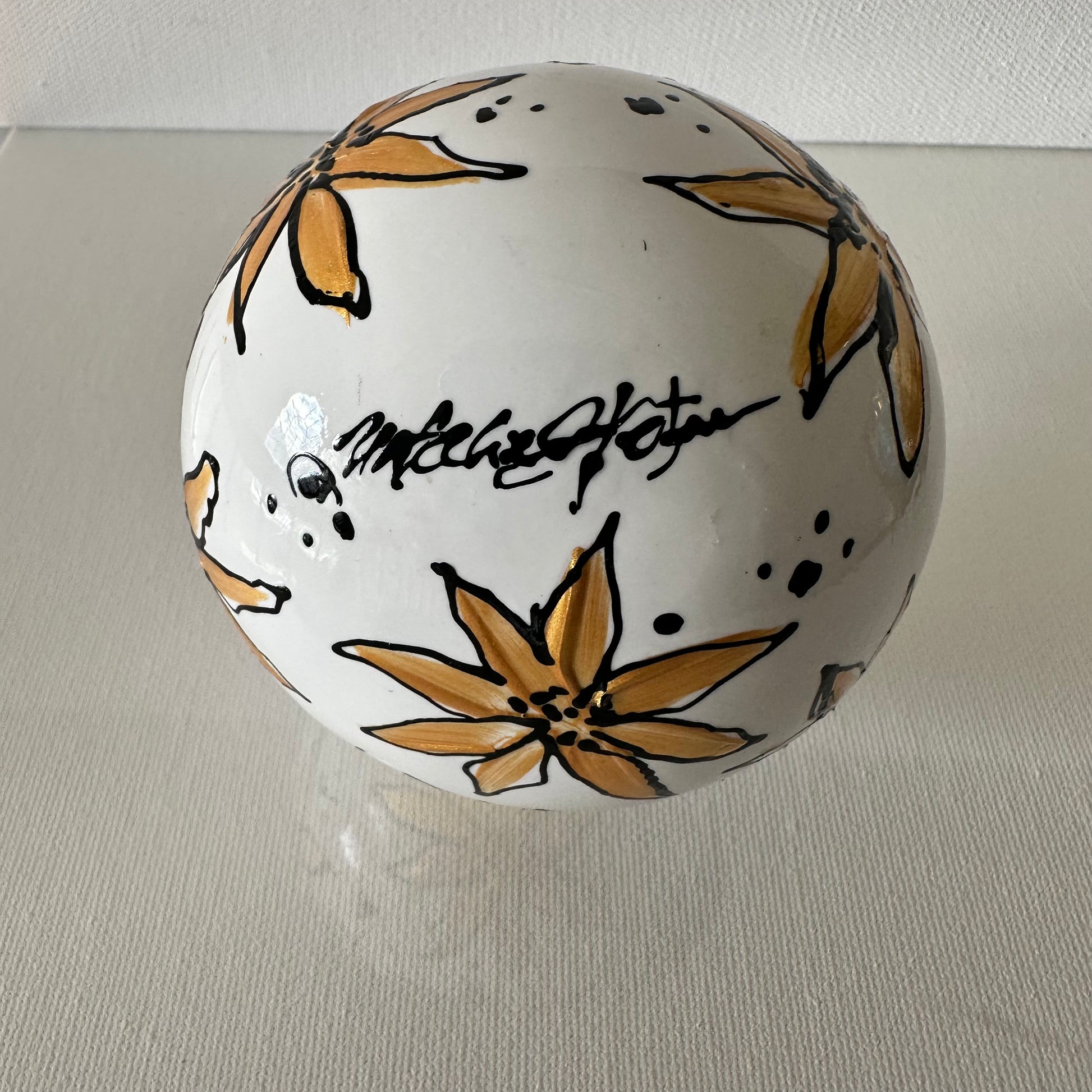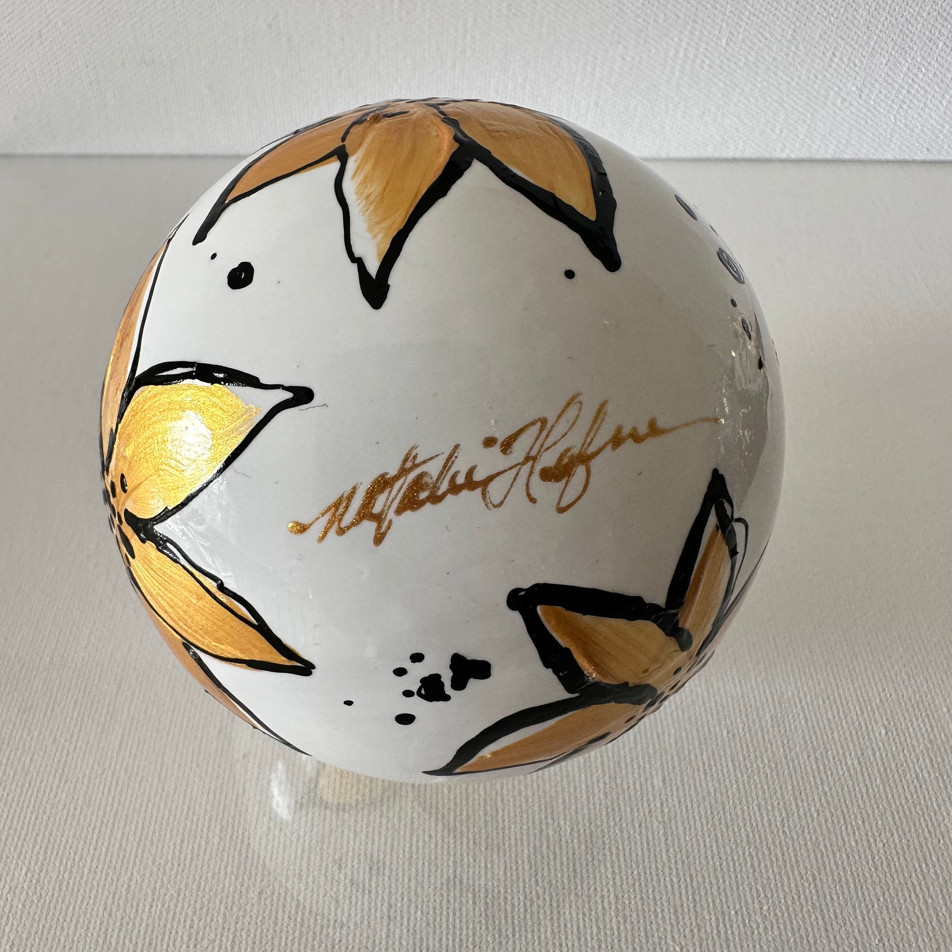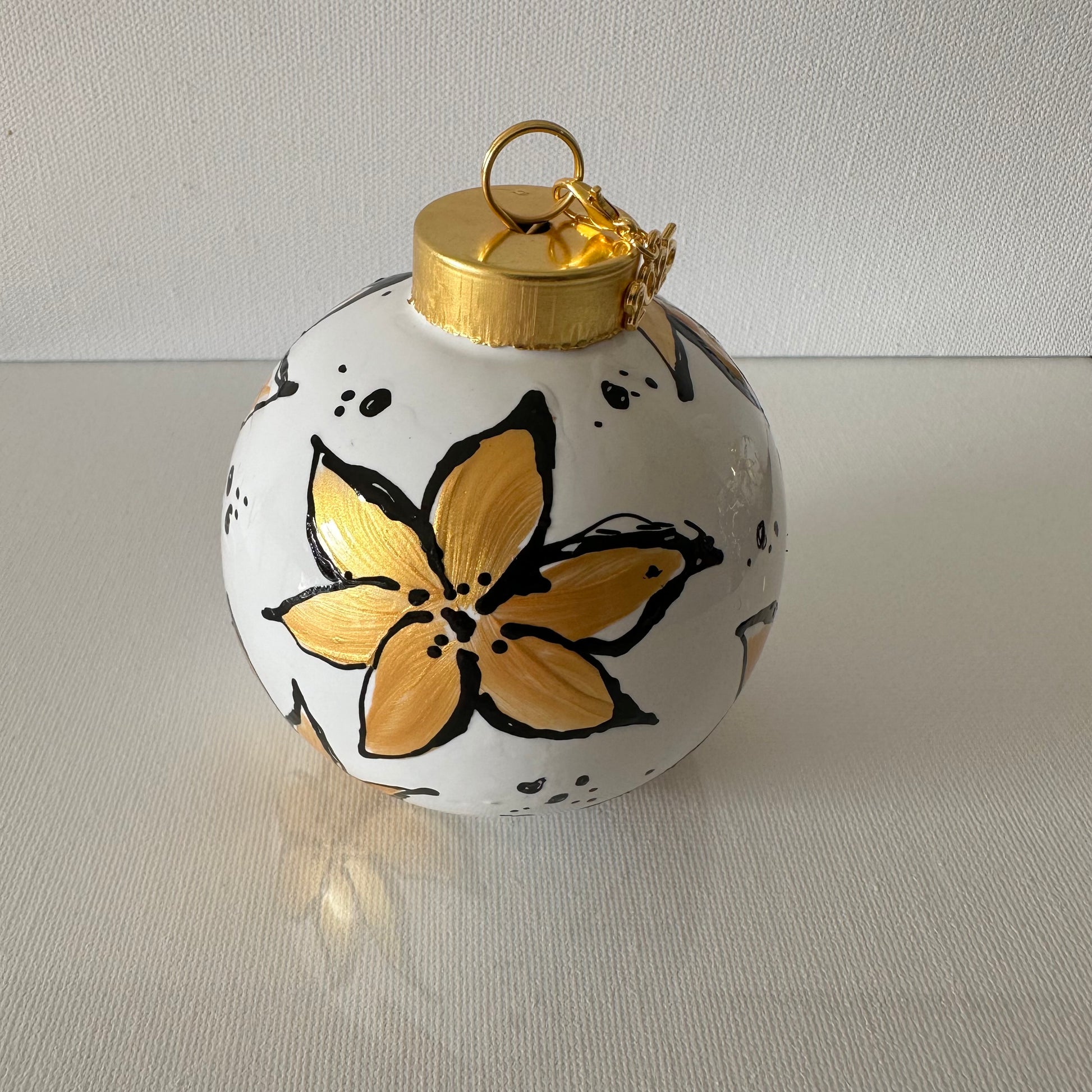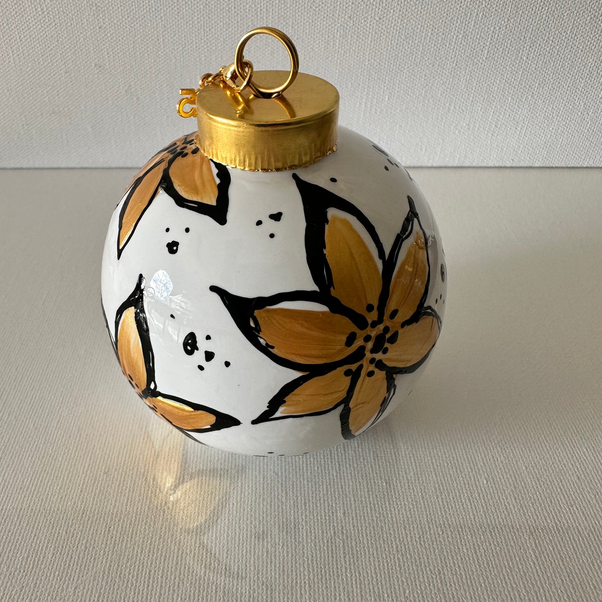 Sketchy Poinsettia is a stunning black and gold heirloom ornament. Golden poinsettia leaves are painted on white ceramic, then finely outlined in black paint to give a sketch drawing effect. The final product may vary slightly from what is pictured as each piece is unique. Features a decorative 2025 edition charm.
